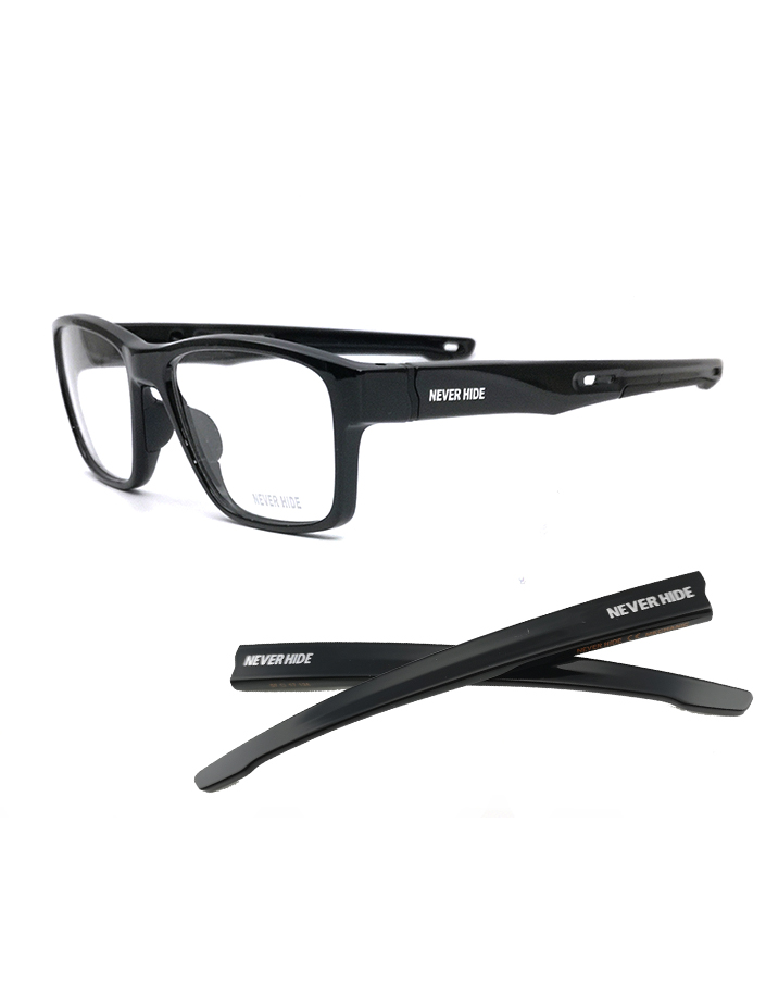 NEVER HIDE inter-changeable temples frame are manufactured in Crystal Nylon Injection, a high-quality polymer that is light, flexible, economic and highly resistant to heat, pressure, knocks and scratches for extremely comfortable eyewear. this frame lets you switch from a lifestyle look to something more sporty for your active interests and gives you two sizes of nosepads to customize the fit.